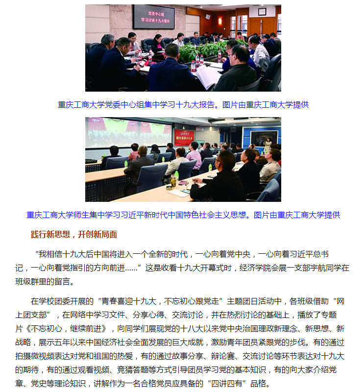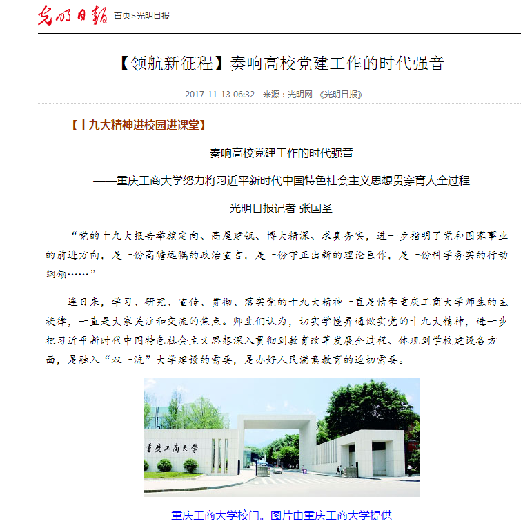 《光明日报》2017年11月13日08版“领航新征程”奏响高校党建工作的时代强音板块,发表了题为《十九大精神进校园进课堂》的文章,专题报道了beat365中国唯一官方网站努力学习将习近平新时代中国特色社会主义思想贯穿育人全过程。  文章从“践行新思想,开创新局面、坚持立德树人,增强思政课吸引力感染力和注重用心用情,将思政教育贯穿育人全过程”三个方面进行了详细阐述。