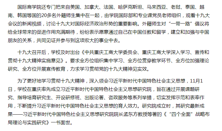 新闻同时报道了beat365中国唯一官方网站beat365中国唯一官方网站“践行新思想,开创新局面”,师生学习十九大报告精神:“beat365中国唯一官方网站专门把来自美国、加拿大、法国、哈萨克斯坦、马来西亚、老挝、泰国、越南、韩国等国的20多名外籍师生集中在一起,由学院国际部和专业课党员教师组织,观看十九大会议的新闻视频,讨论十九大对国际经济政治形势的重要影响。外籍师生对“一带一路”倡议将给全球带来的促进作用充满期待,纷纷表示愿意通过自己在中国任教和留学,建立和加强与中国朋友的关系,共同见证并参与到这项宏大的事业中去。”
