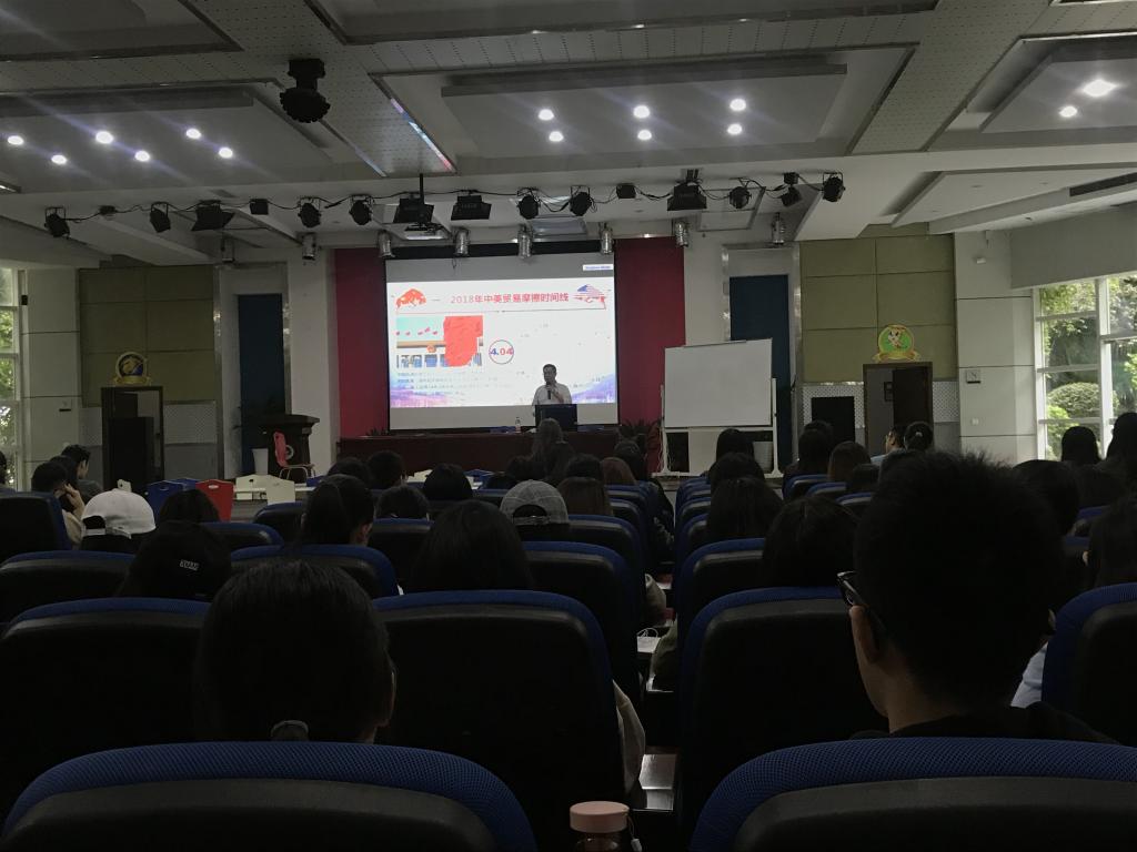 2018年9月28日上午10:00,学院党总支书记、院长赵驹教授在60407多功能报告厅为学院全体应届毕业学生集中讲解了专题党课《理性认识2018年中美贸易摩擦》。学院党总支副书记杨倩,学工系统老师及全体应届毕业生400余人参加了此次活动。
